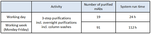 ? ? ? ?Discovery高通量(HT)型系統(tǒng),采用Protein A - CIEX- Desalting三步向?qū)K,每次上樣10 mL單抗上清液(1.0 mg/mL),每次產(chǎn)量均≥6.5 mg。單個(gè)樣品的三步純化耗時(shí)約為74 min,在24 h內(nèi)純化出多達(dá)19個(gè)樣品,而且該時(shí)間包含了層析柱的清洗環(huán)節(jié)。該系統(tǒng)持續(xù)運(yùn)行5天,純化樣品總數(shù)量高達(dá)91個(gè)。