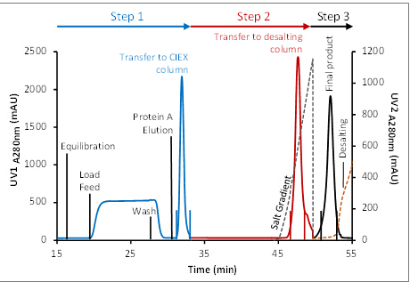 ? ? ? ?在該過(guò)程中,Protein A的洗脫組分經(jīng)過(guò)在線(xiàn)稀釋?zhuān)苯由蠘又罜IEX層析柱,CIEX進(jìn)行線(xiàn)性洗脫,去除降解物及聚集體,將目標(biāo)組分直接上樣至脫鹽柱。三步層析緊密銜接,前一步層析的洗脫與后一步層析的上樣同時(shí)進(jìn)行,使得純化效率顯著提高。