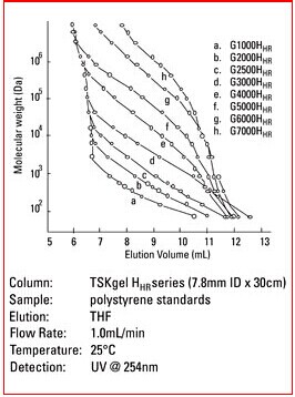 TSKgel G2500Hhr色譜柱內裝填的是多孔的剛性聚合物顆粒。適合對分子量小于20,000 Da的寡聚物進行非水相分離。TSKgel G2500Hhr色譜柱的出貨溶劑是THF,可以置換成其他各種有機溶劑。