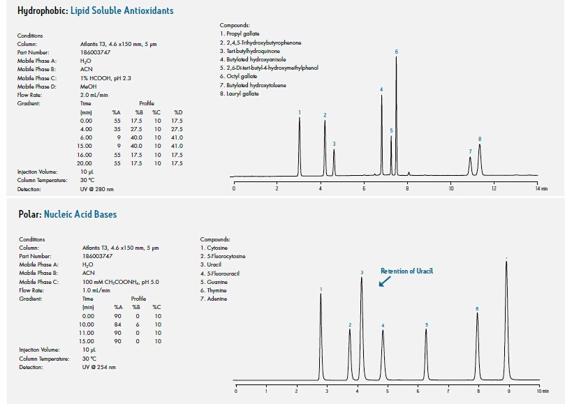 在對于極性化合物的反相HPLC保留與分離方面,Atlantis T3為極性化合物保留設立了行業標準。Atlantis T3色譜柱是通用的、硅膠反相C18柱,它不僅能保留和分離水溶性的極性小分子有機化合物,而且還為這項優異能力提供了更寬的pH操作范圍。對于反相應用,要開發極性(和非極性)化合物的保留分離方法時,Atlantis T3應該作為第一選擇。