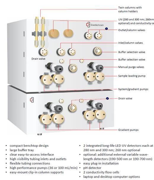 層析系統,已由2004年的6-8柱位設計、2006年的3柱位設計,發展為最優化的2柱位設計,可運行多種層析模式,如標準批處理過程、MCSGP(多柱逆流溶劑梯度純化)、N-Rich等,實現了層析新技術與層析系統軟硬件設計的完美結合,使得設備成本更低,構造更為簡化,并可使層析填料、緩沖液等成本投入大為節省,同時也使得純化周期大為縮短。