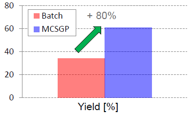 MCSGP可將產品純度從傳統工藝的59%提升至70%,將收率從傳統工藝的34%提升至61%,從而使產量(g /L /h)整體提升80%,并同時使Buffer的消耗量降低55%MCSGP工藝,無疑可顯著地節約成本投入,并可產生更多的生產效益。