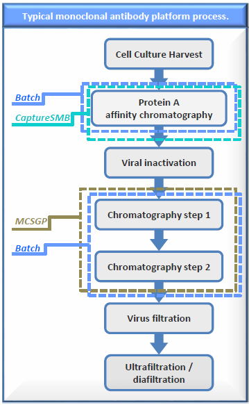 傳統層析工藝,由于流穿效應,有30-50%的填料是無法被完全利用的,從而使得載量和處理量大為受限。Capture SMB用于優化捕獲環節,作為最簡單和最強大的2柱位設計,可使純化效率顯著提高,并且使填料用量大為縮減。