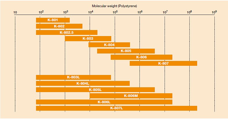 GPC K-804L是標準的油溶性SEC色譜柱,適用于從低分子量到高分子量的寬范圍的樣品。GPC KF-804L色譜柱是適合分子量分布廣的樣品的混合填料色譜柱。流動相是氯仿。