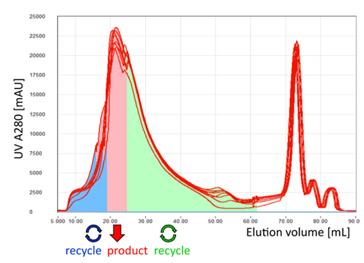 采用MCSGP,可將含有不純組分的產品回收再純化, 進行循環式的層析操作,從而最大限度地提純產品, 使得純度和收率二者兼得。