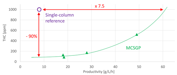 MCSGP可用于不同工藝要求。如果對目標產品的純度要求并不高,采用MCSGP可使產率進一步提高。比如某企業要求THC含量上限為1000 ppm時,收率水平不得低于85%,用MCSGP代替單柱層析后,產率由原來的8 g/L/h提高到了60 g/L/h以上。而另一工藝情況為,當從單柱層析轉換為MCSGP時,保持產率不變,雜質THC含量可從1000 ppm降低至100 ppm。見圖12純度 - 產率曲線。