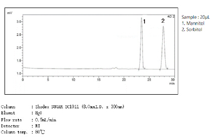 美國藥典USP規(guī)定,分析甘露醇使用符合L19填料要求的色譜柱,柱子尺寸7.8*300mm,甘露醇與山梨醇的分離度達到2以上。使用Shodex SUGAR SC1011-7F能完全符合美國藥典要求。