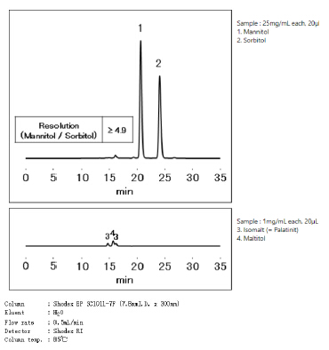 歐洲藥典EP和日本藥典JP規(guī)定,分析甘露醇使用Ca型強陽離子交換柱,色譜柱尺寸7.8*300mm,甘露醇與山梨醇的分離度達到2以上。同樣對應(yīng)Shodex SUGAR SC1011-7F,能夠符合歐洲藥典/日本藥典的要求。