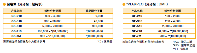 Asahipak GF系列色譜柱是具有良好的耐溶劑性的聚合物基質的水溶性/油溶性兩用SEC色譜柱,水和有機溶劑都適用。