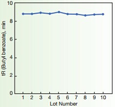 ??? 上圖顯示了疏水性作用的10批生產(chǎn)的批間再現(xiàn)性,這是色譜柱的基本參數(shù),通過對生產(chǎn)過程的嚴格控制,獲得極穩(wěn)定的批間再現(xiàn)性。其顯示了非常高的批次間重復性,在分析丁苯時候,以10批柱子的數(shù)據(jù)為例,保留時間的標準偏差小于1.5%,這數(shù)據(jù)大大低于普通的C18色譜柱。分析標準物質(zhì)時,每根色譜柱的理論塔板數(shù)可達18600,壓力為2600psi。